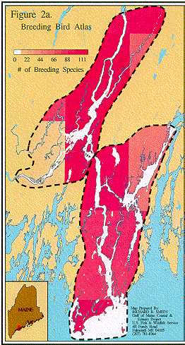 The number of bird species for which indications of breeding were observed is shown for each USGS 7.5 minute quad of the focus area. Because the data are accumulated from inputs by a number of volunteers rather than a survey with consistent level of effort, the interpretation must be regarded with caution. This also applies to the herpetological data (below). The database was obtained from MDIFW (original source: Adamus, P.R. 1988. Atlas of Breeding Birds of Maine, 1978-1983. MDIFW, Augusta. 366pp.).